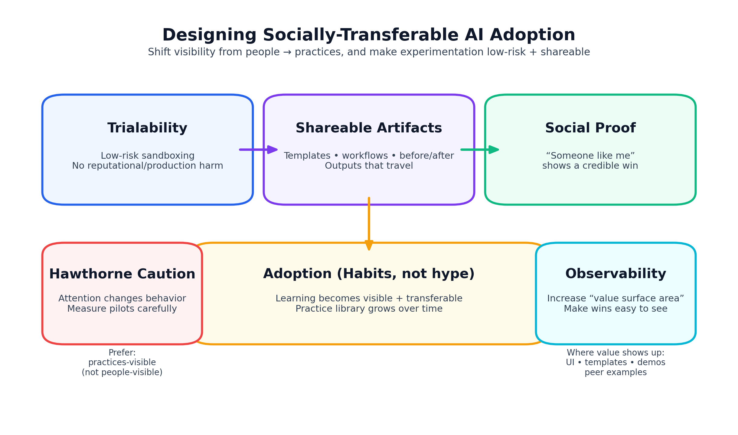 · Use visibility as an adoption lever: spotlight repeatable workflows and peer examples to create social proof, not pressure.
